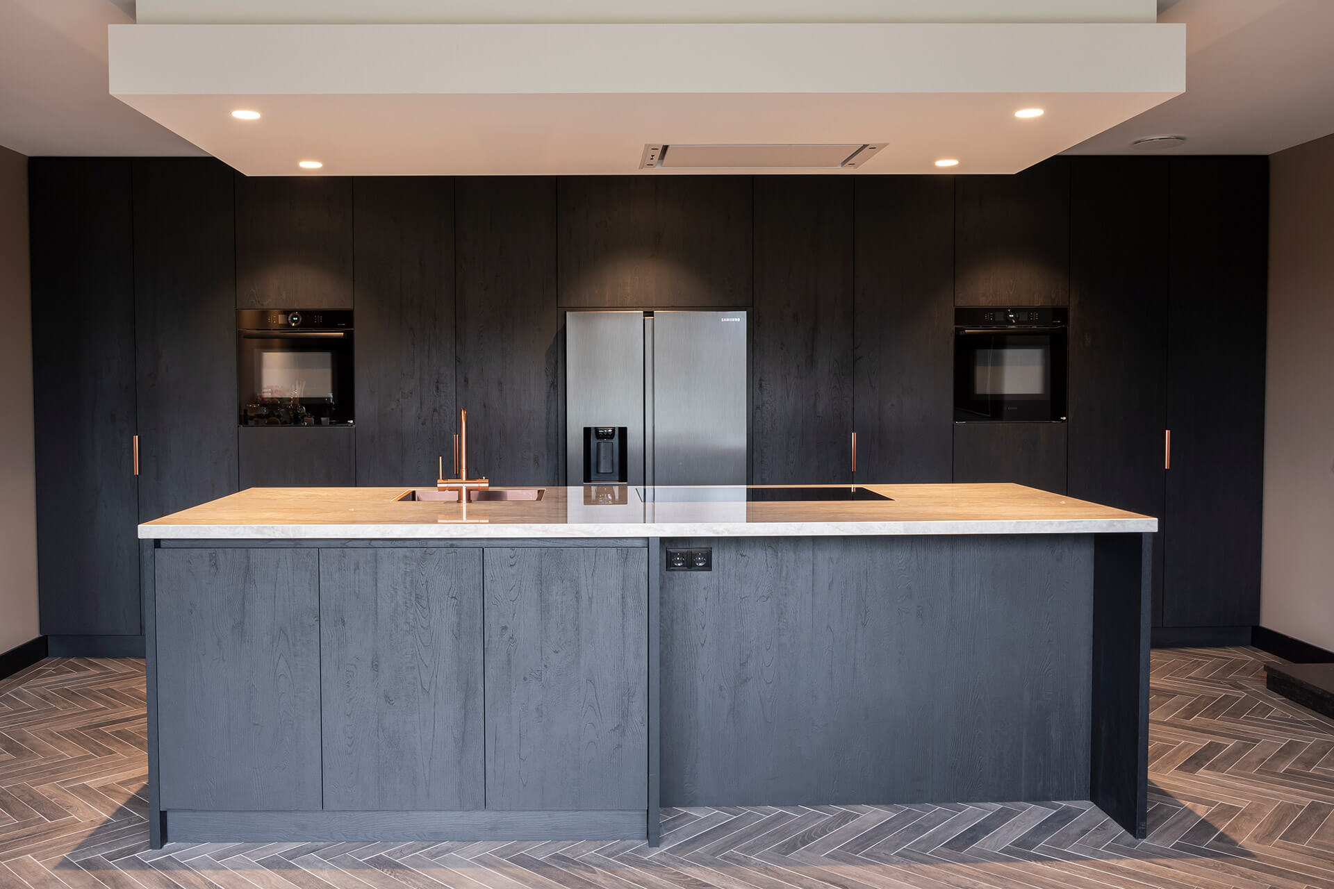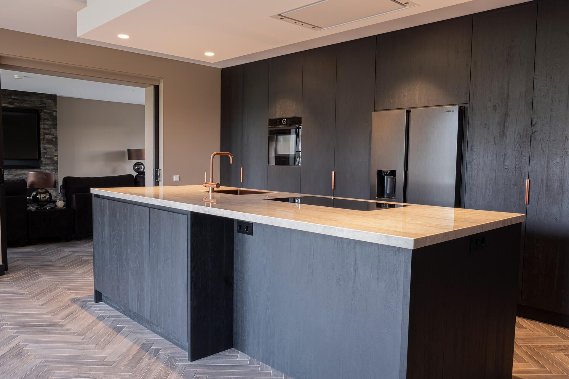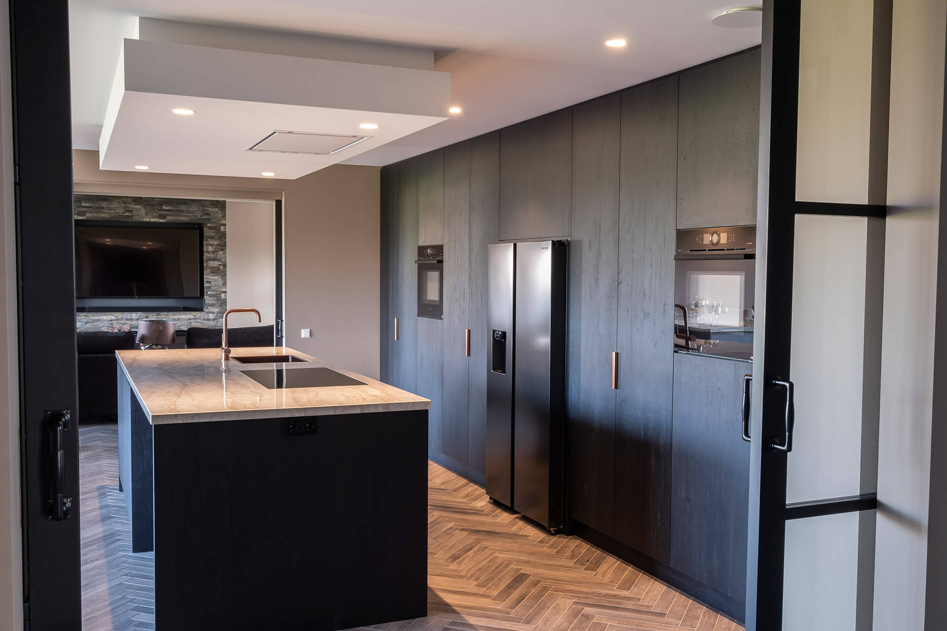 Voor het interieur van de woonkeuken in deze oude gerenoveerde bollenschuur hebben we – bij de whitewash eikenhouten visgraatvloer – gekozen voor stoer, contrasterend zwart plaatmateriaal. Om de donkere elementen te doorbreken, zijn de details uitgevoerd in koper: koperen kraan, koperen vlakke inbouwspoelbak en koperkleurige verticale handgrepen op de kastenwand. De spoelbak en kookplaat zijn volledig geïntegreerd in het lichtgekleurde keramische werkblad.