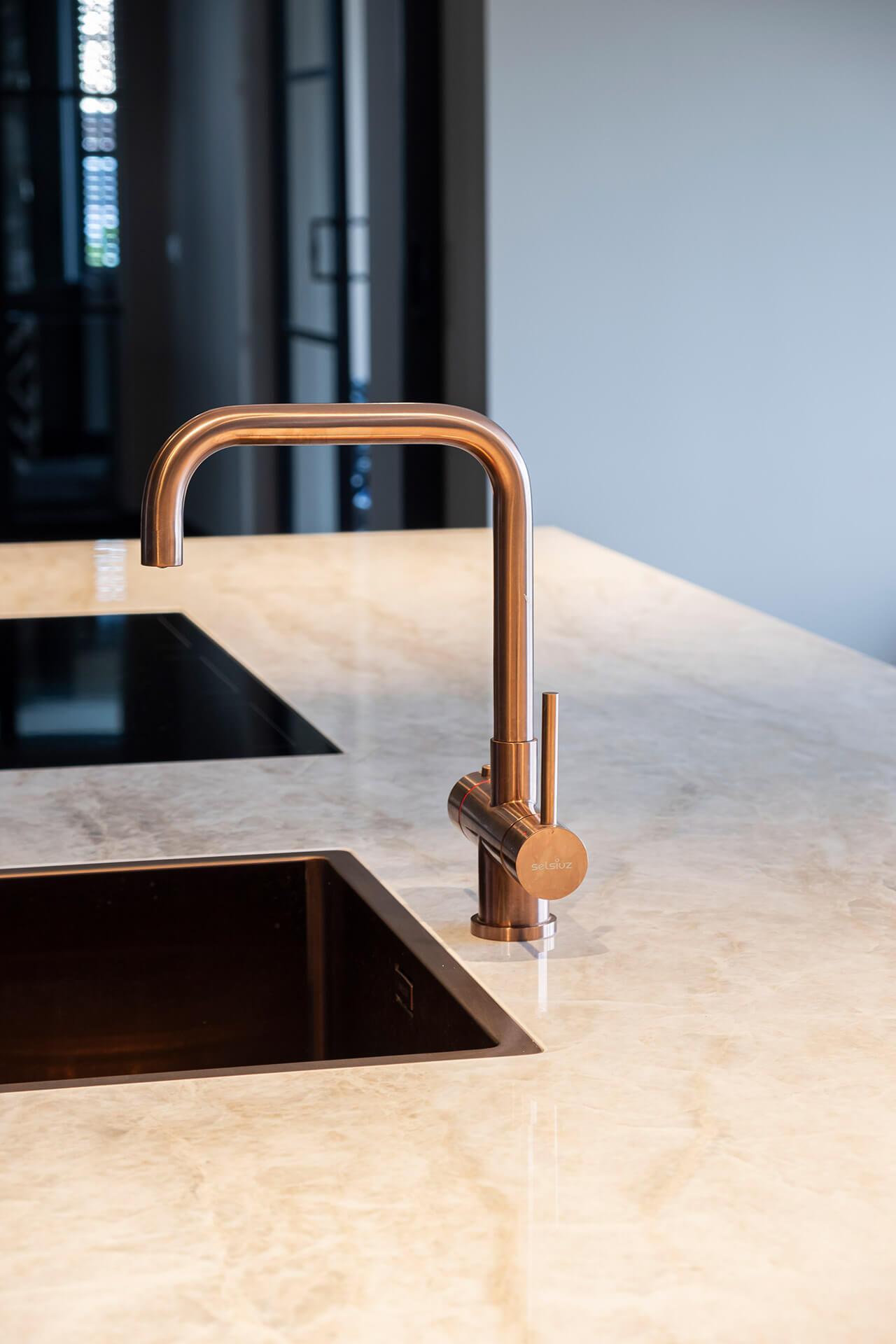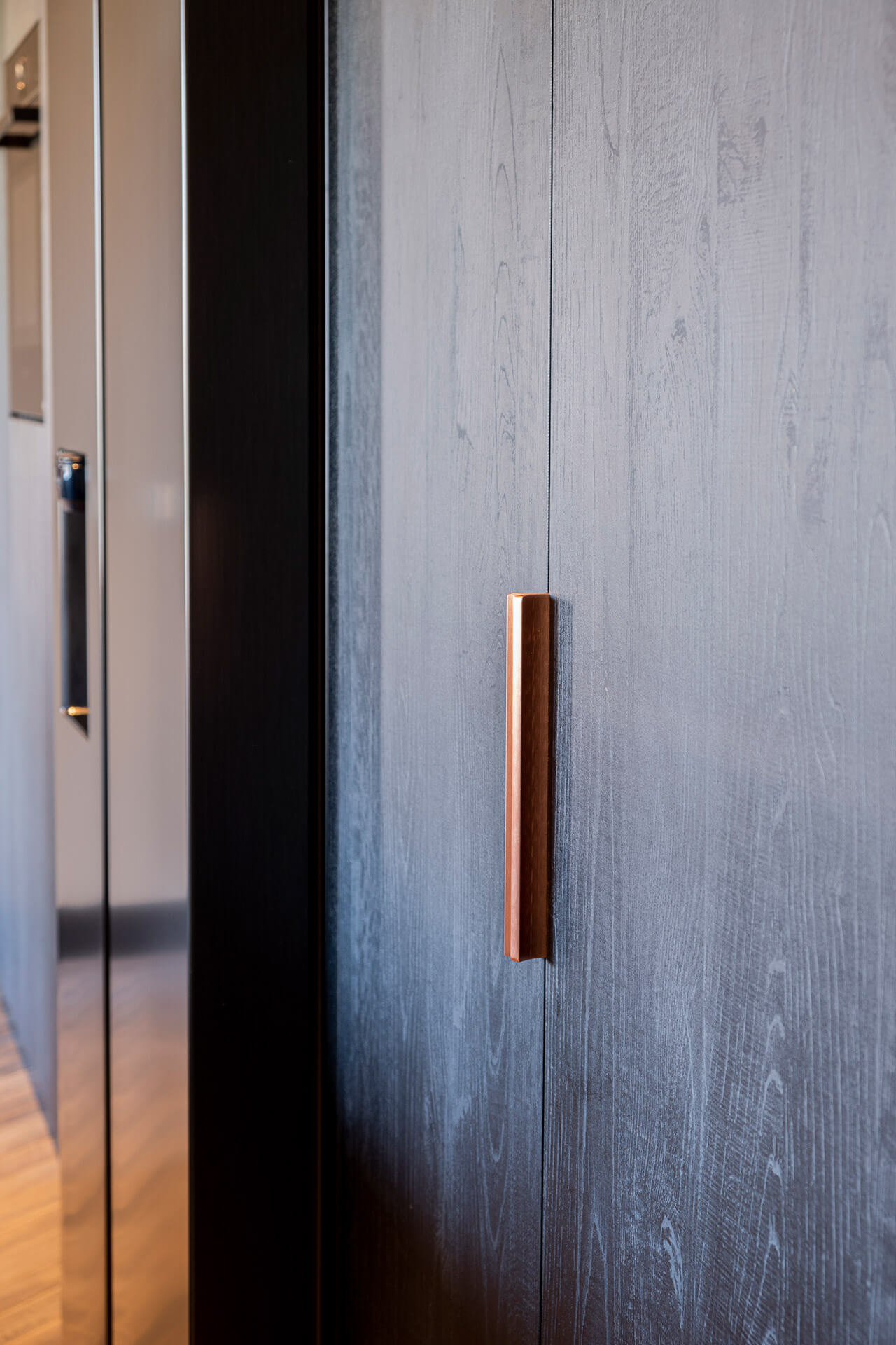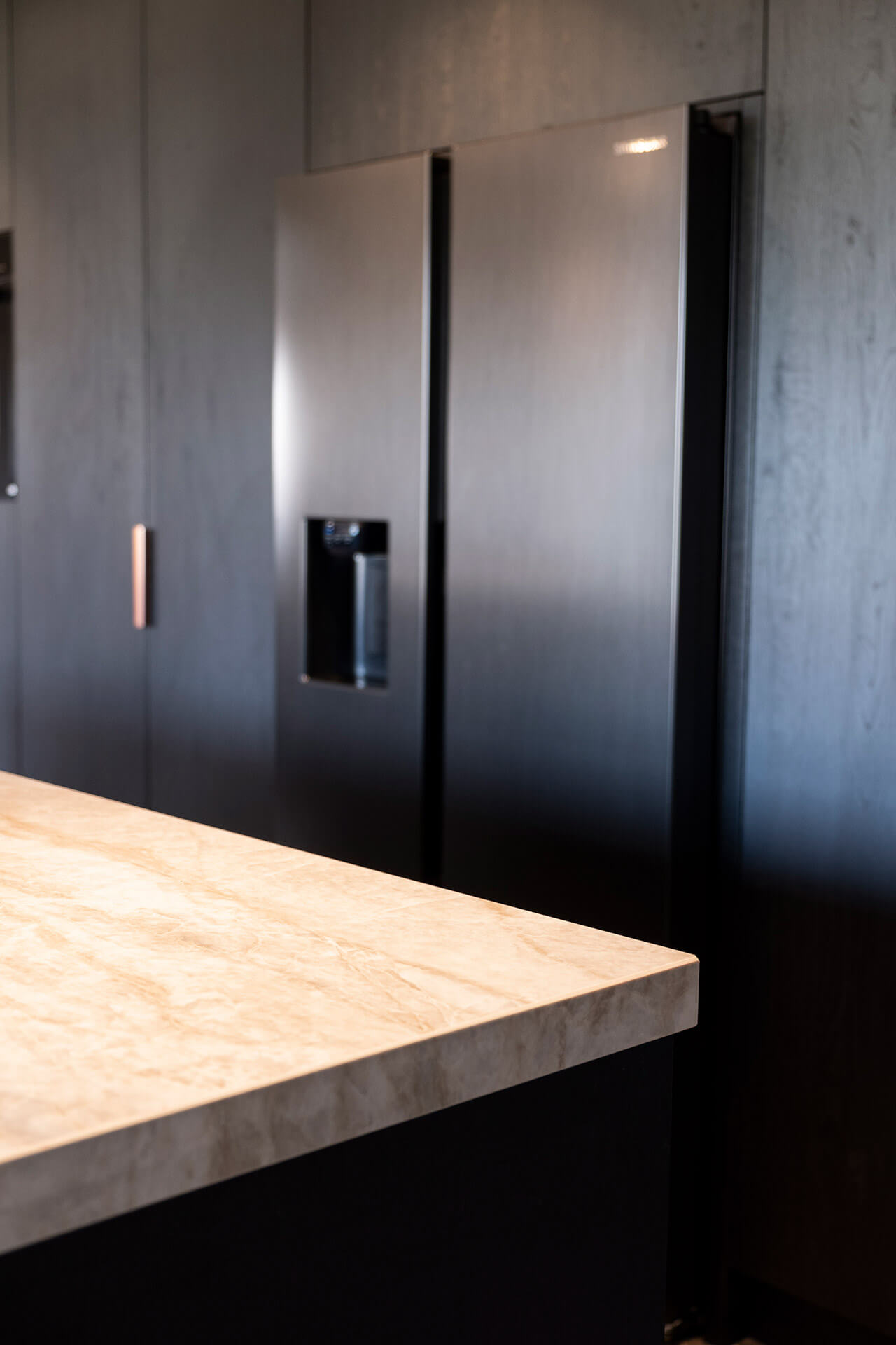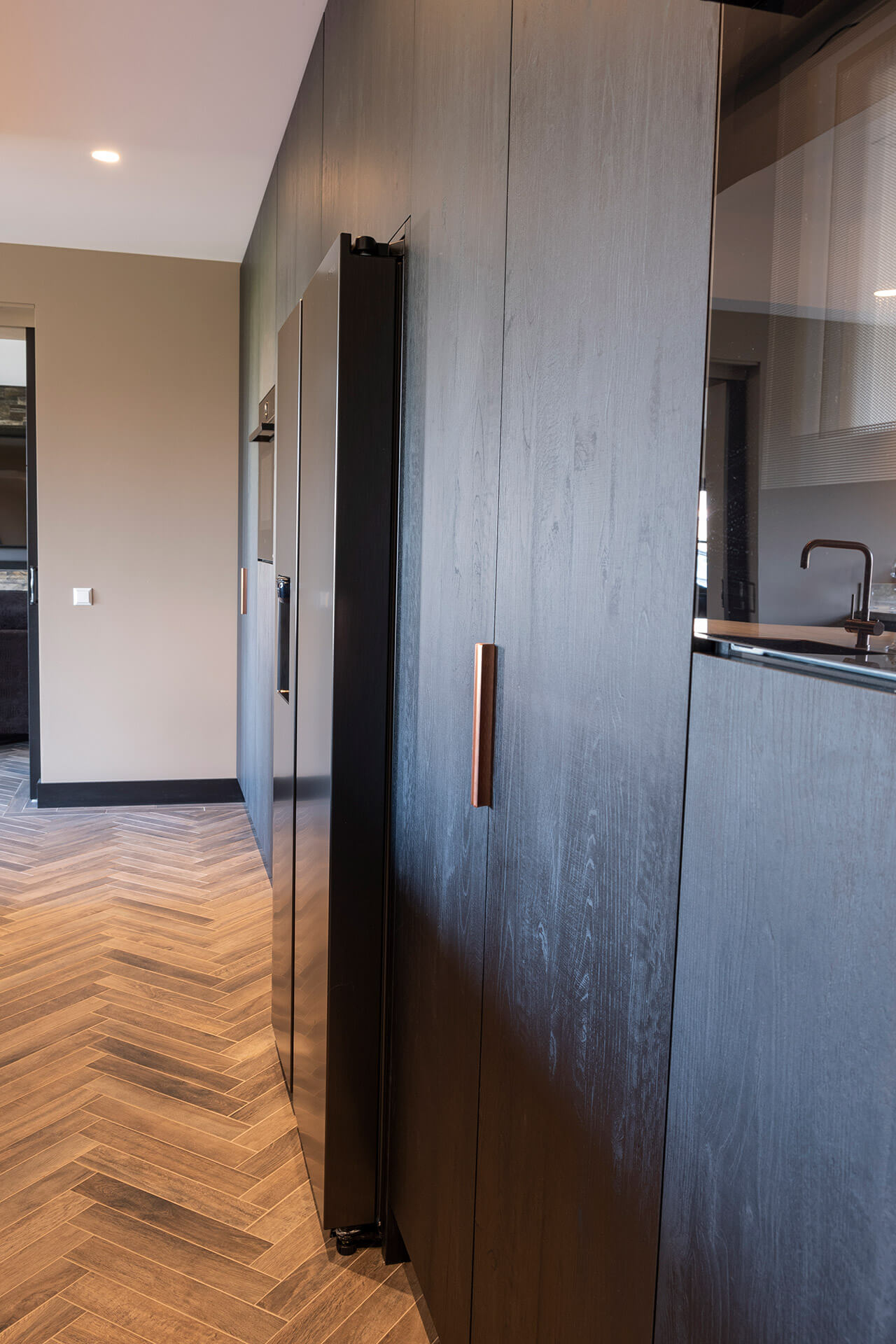 Voor het interieur van de woonkeuken in deze oude gerenoveerde bollenschuur hebben we – bij de whitewash eikenhouten visgraatvloer – gekozen voor stoer, contrasterend zwart plaatmateriaal. Om de donkere elementen te doorbreken, zijn de details uitgevoerd in koper: koperen kraan, koperen vlakke inbouwspoelbak en koperkleurige verticale handgrepen op de kastenwand. De spoelbak en kookplaat zijn volledig geïntegreerd in het lichtgekleurde keramische werkblad.