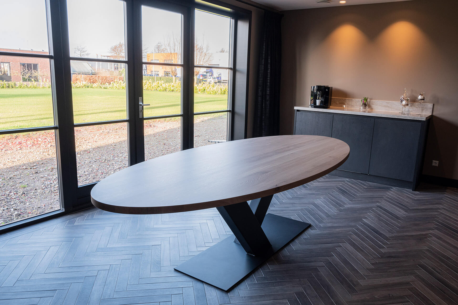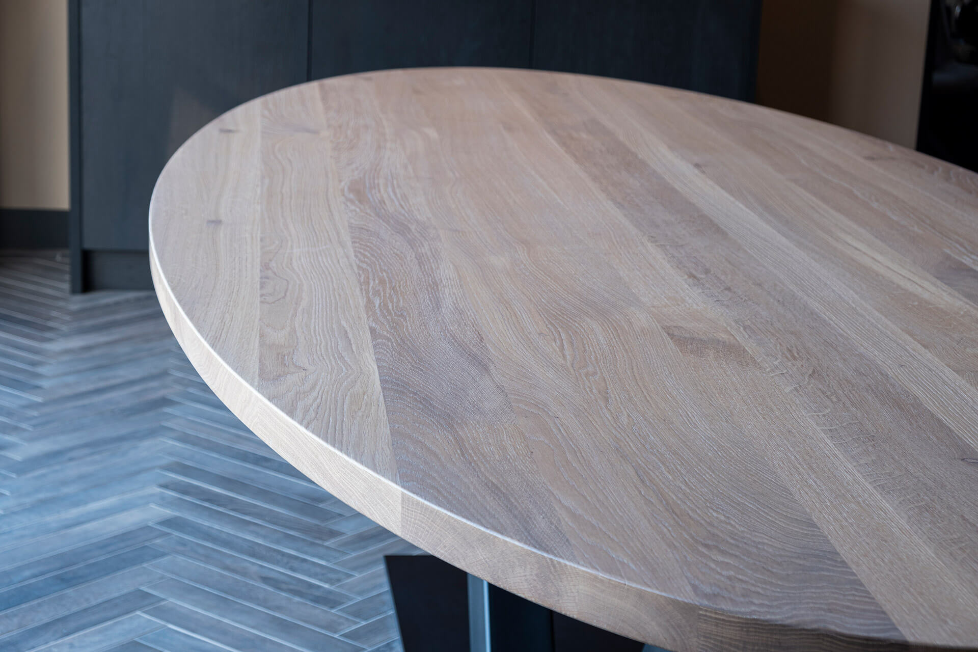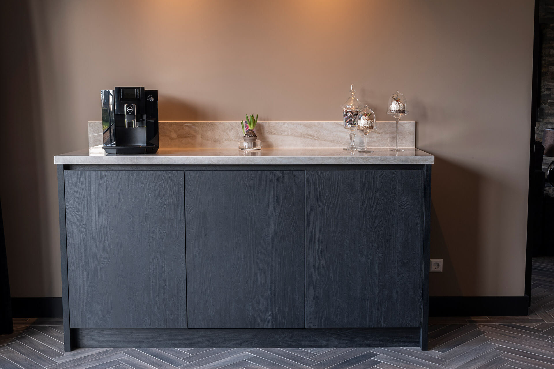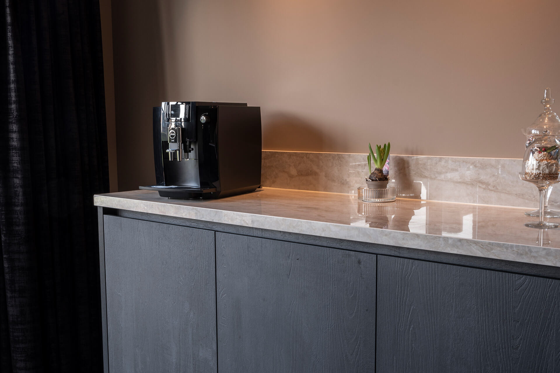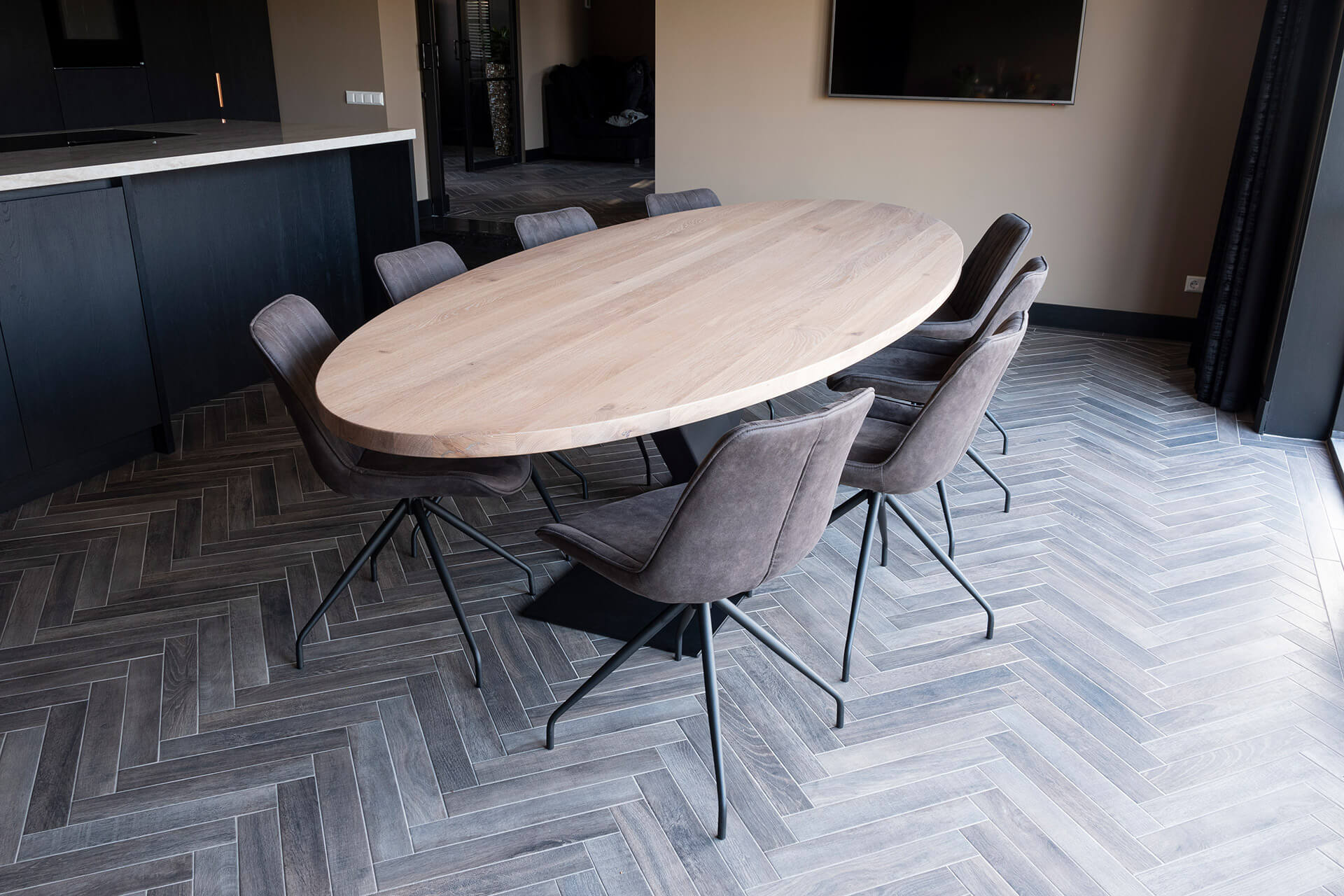 Ook het koffiemeubel is voorzien van hetzelfde gemarmerde keramisch blad, met een natuurstenen uitstraling. Boven het kookeiland realiseerden we een verlaagd plafond (wit stucwerk), met geïntegreerde inbouwspots en afzuigkap. De royale stoere eettafel op maat heeft een stalen v-voet en eikenhouten blad. Het tafelblad is behandeld met whitewash olie, passend bij de uitstraling van de vloer.