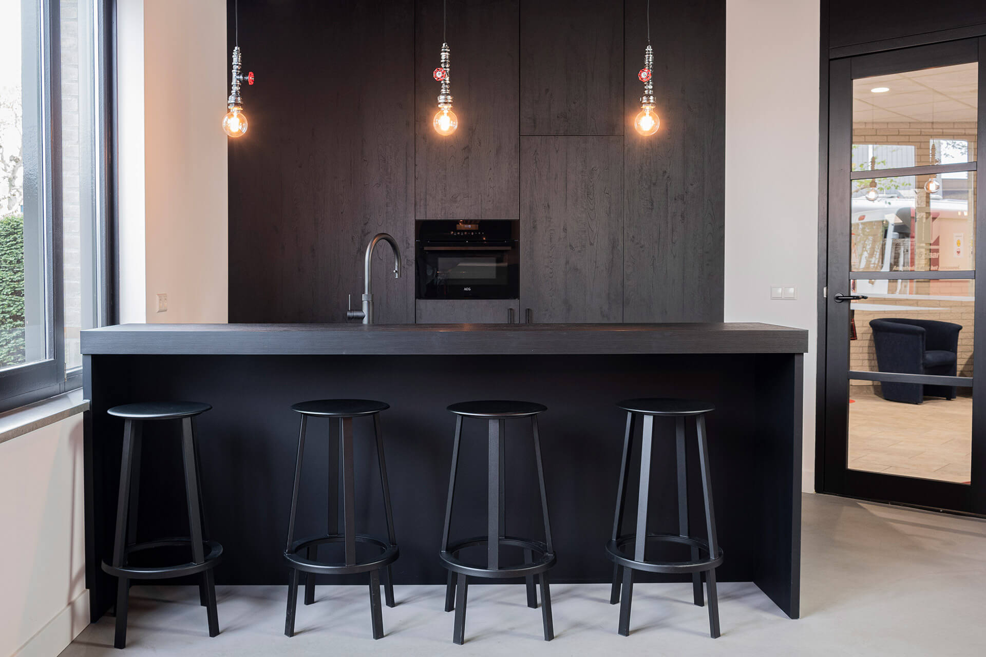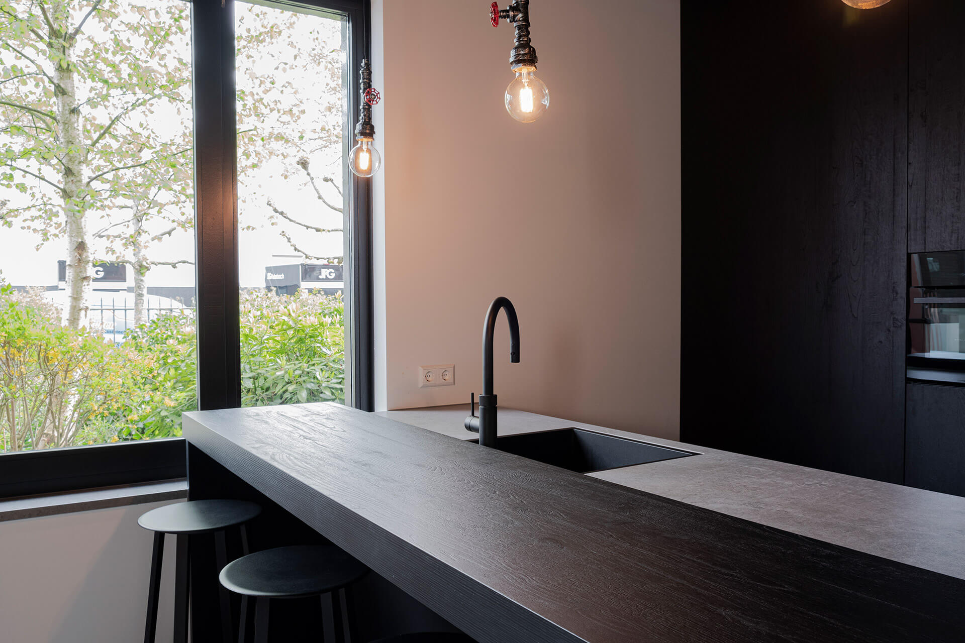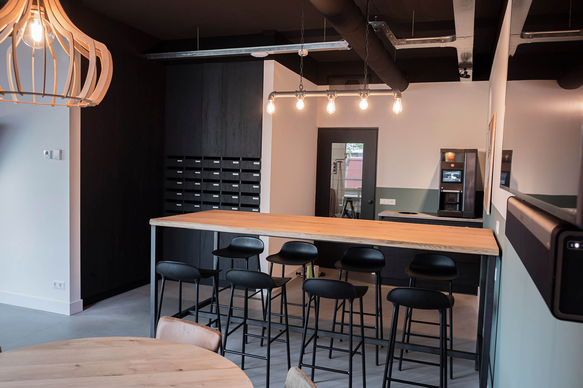 De kamerhoge matzwarte kastenwand met ingebouwde combimagnetron is volledig maatwerk. En dat geldt ook voor het aanrecht met quooker en bar, de kast met postvakken voor de medewerkers en de pantry met koffiezetapparaat. Het eindresultaat mag er zijn: een Bedrijfskantine met een hoofdletter B.