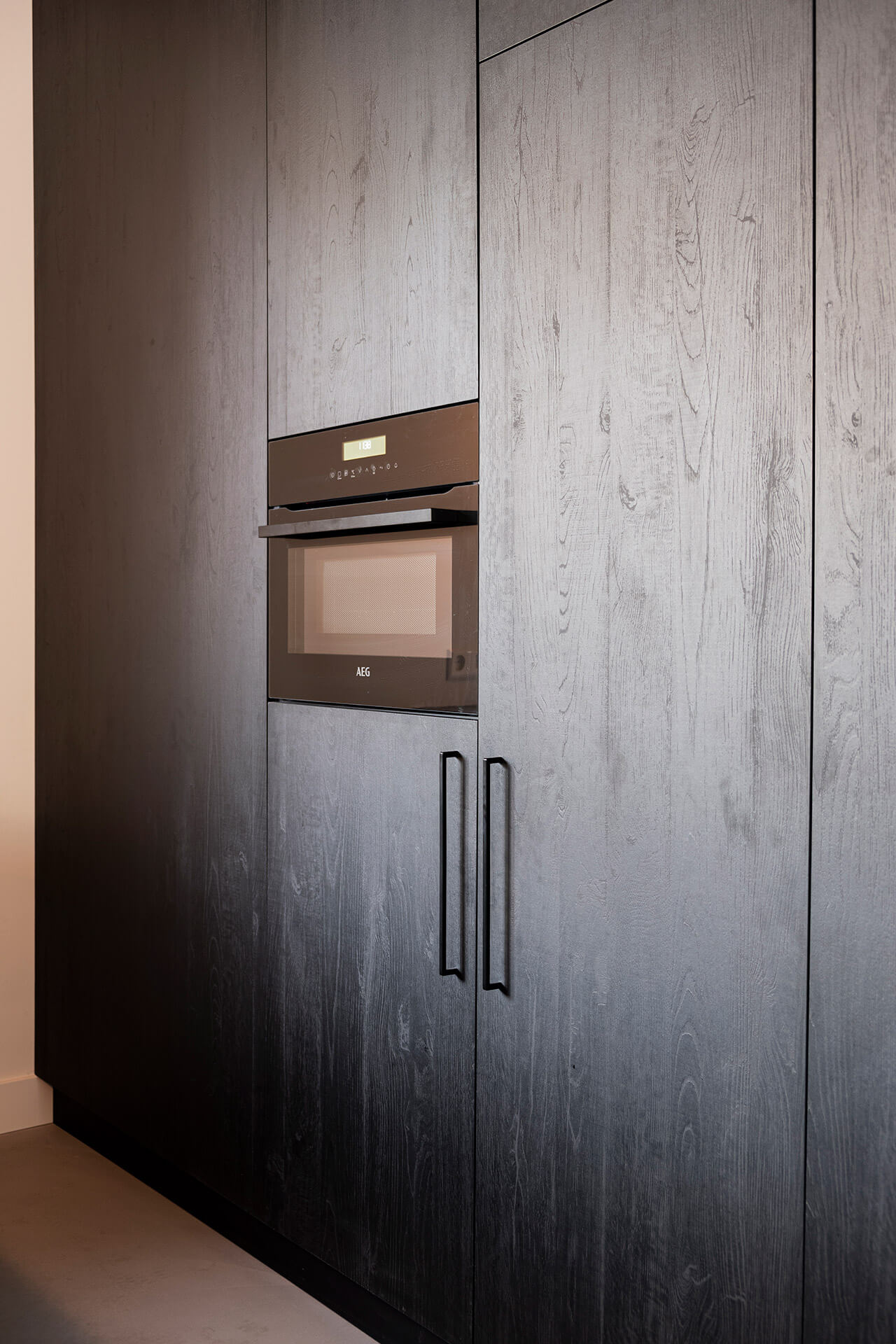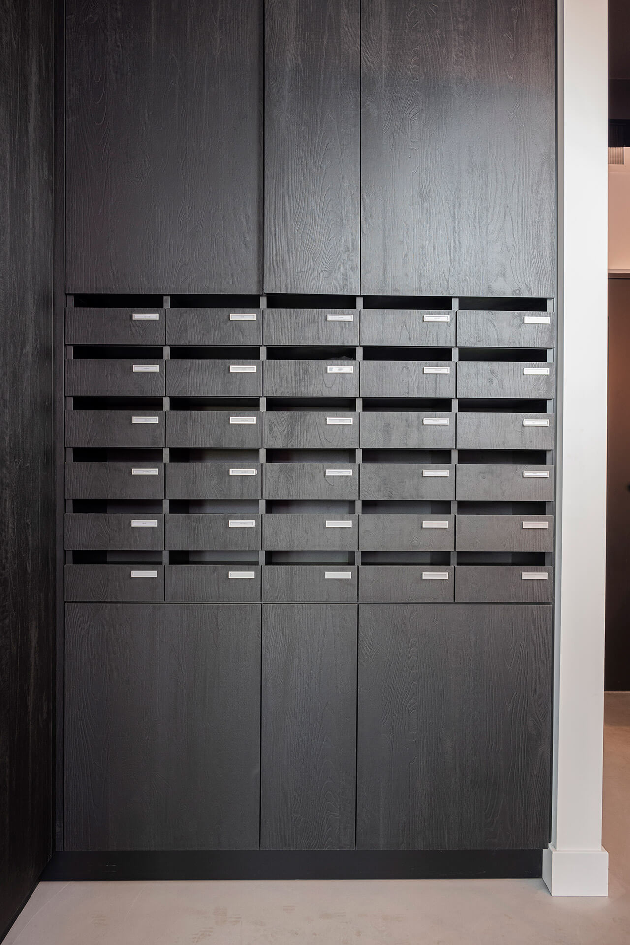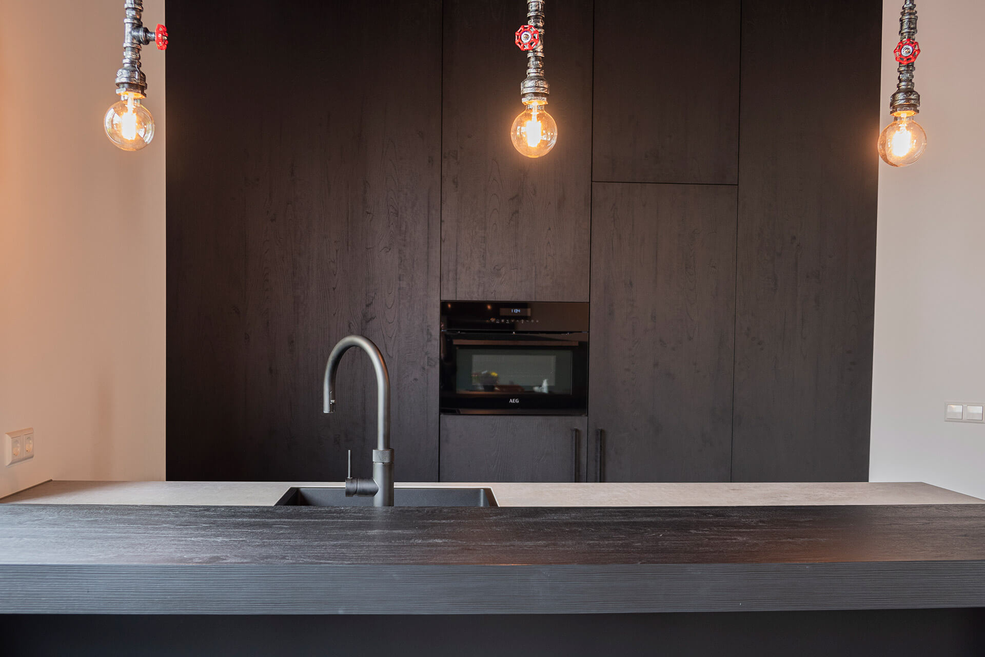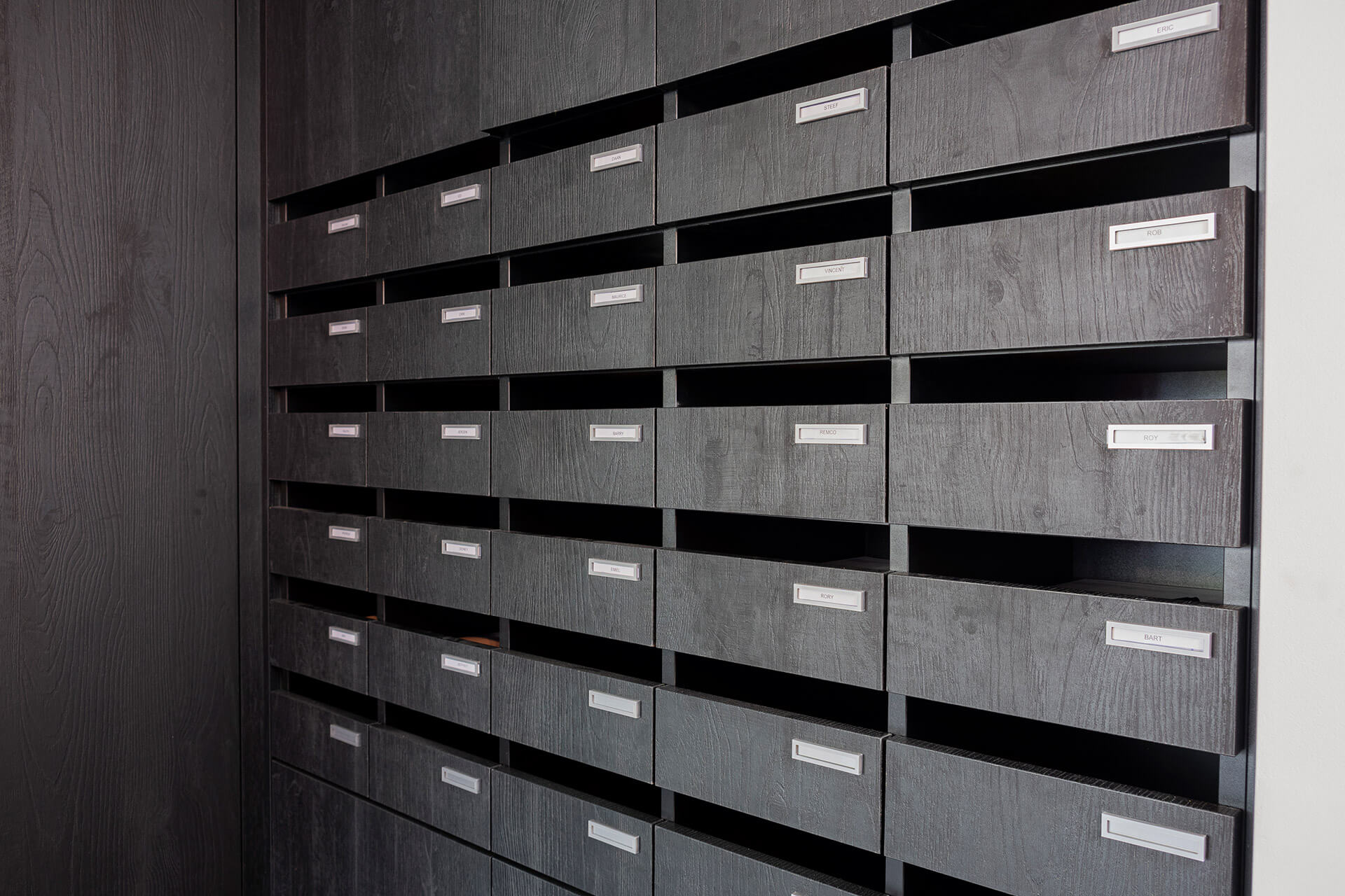 De kamerhoge matzwarte kastenwand met ingebouwde combimagnetron is volledig maatwerk. En dat geldt ook voor het aanrecht met quooker en bar, de kast met postvakken voor de medewerkers en de pantry met koffiezetapparaat. Het eindresultaat mag er zijn: een Bedrijfskantine met een hoofdletter B.