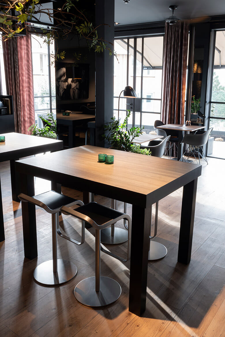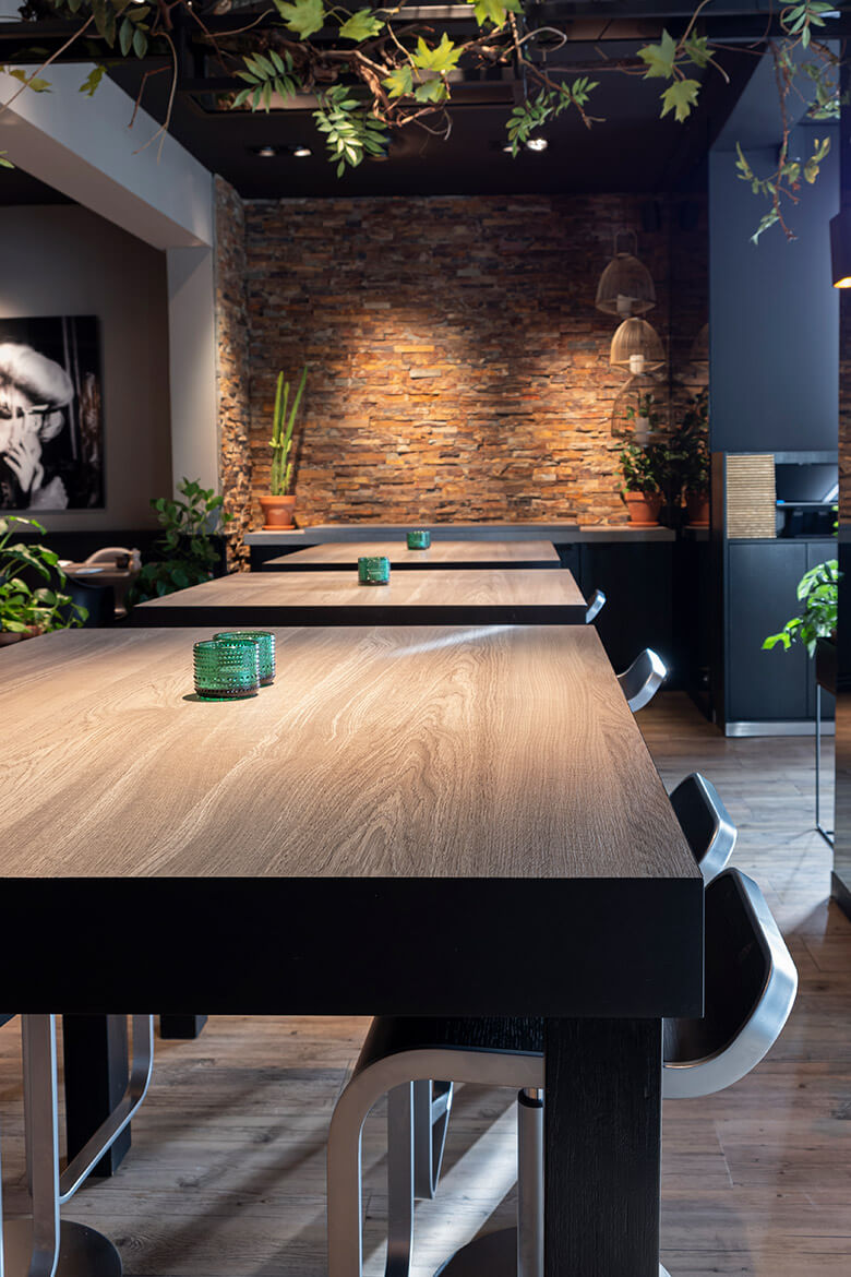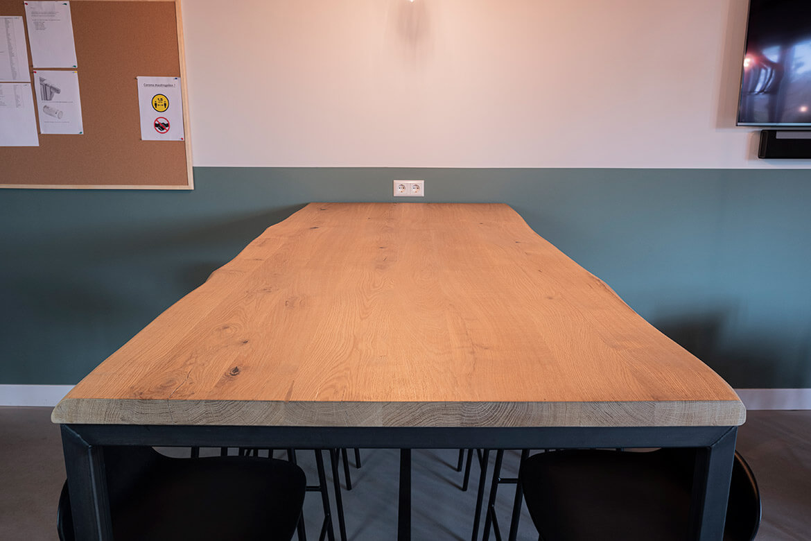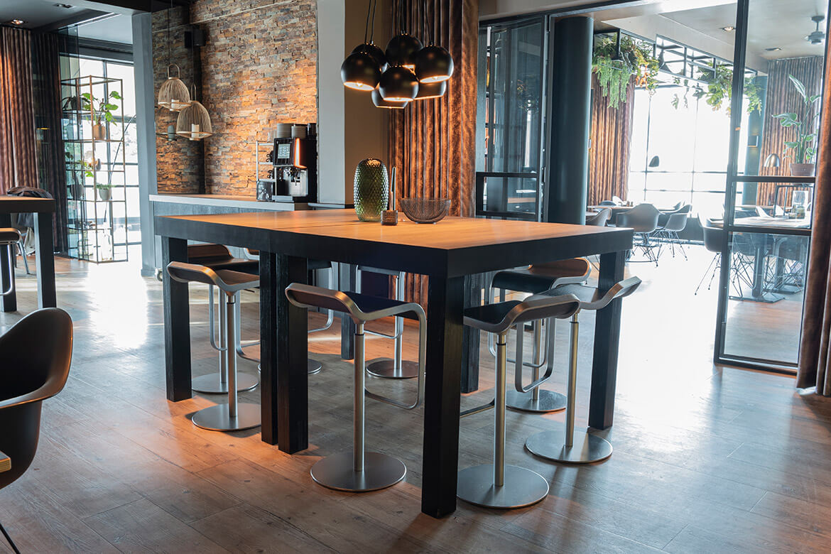 Naast maatwerkoplossingen voor woningen, realiseren we ook bedrijfsmatige projecten. Wat denkt u van een royale vergadertafel op maat? Met bijvoorbeeld een robuust boomstam-tafelblad met schorsrand. Een balie in de ontvangstruimte. Tafeltjes met vaste banken in de bedrijfskantine, zoals in een Amerikaanse diner. Doordat we maatwerk leveren, zijn er ook qua afwerking vele opties. Geïntegreerde ledverlichting, verspringend in vele kleuren, geeft een extra accent aan een barmeubel. Of bijvoorbeeld gecapitonneerde bekleding (à la Chesterfield) voor een vaste hoekbank in een restaurant.